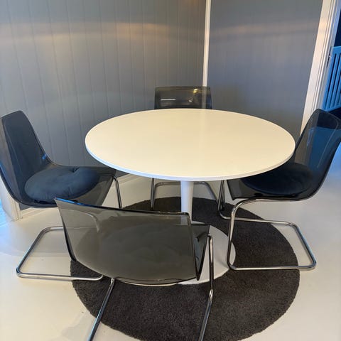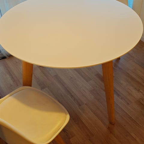 Rundt spisebord med bein av eik. Det er noen synlige merker på bordet som vist på bildene, men dette kan males over☺️