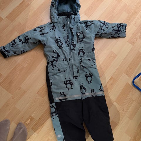Reima barnedress i størrelse 128 for jenter, laget av polyester. Dressen har blå farge med mønster i rosa og mørk blå. Den har elastiske mansjetter ved armer og ben, samt refleksdetaljer. Noen mindre merker og slitasje er synlige på materialet, se bilder