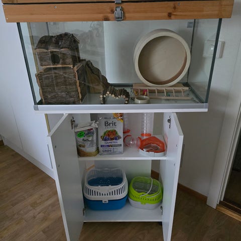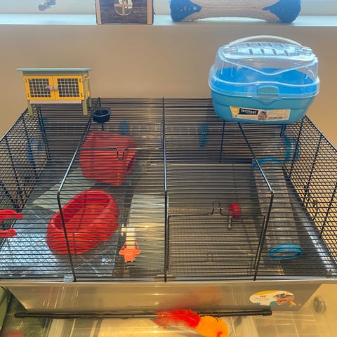 Klatremus hamsterbur med flere nivåer og tilbehør inkludert rør, hjul, hus og matstasjon. Buret har en fargekombinasjon av grønt, blått og rosa. Passer for smågnagere som hamster.