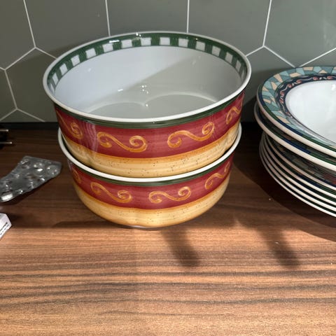 middagstallerken og suppe med blå kant. Serviset består av tallerkener i porselen med en blå og hvit fargekombinasjon. Passer til daglig bruk og spesielle anledninger.Pris får en 150kr.