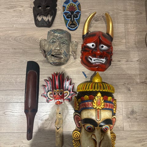 Selger unna et par flotte og tøffe tremasker. Begge er store i størrelsen, og den største måler rundt 1 meter, mens den andre måler rundt 60 cm.