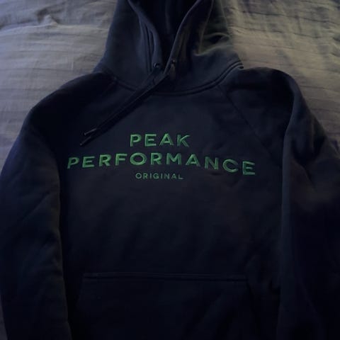 Peak Performance hettegenser / Hood i størrelse M, grønn farge og laget av bomull 80% og 20% Polyester.