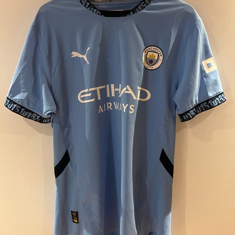 Puma Manchester City fotballdrakt i blå farge. Drakten har klubbens logo og sponsorlogo på fronten. Laget av lett materiale egnet for sportsbruk.
