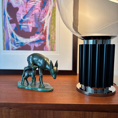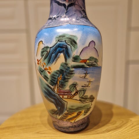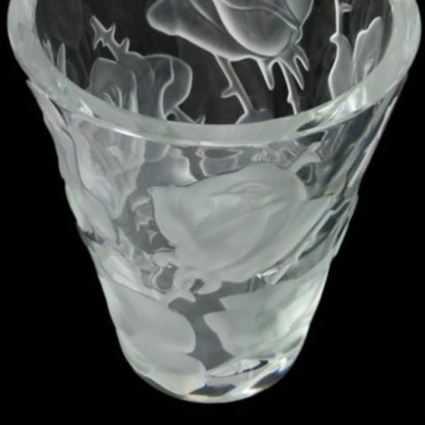 Selger usedvanlig pen vase/skål designet av Marc Lalique i 1956. Den er laget av både klart og matt krystallglass og viser to sammenfletttede duer i harmoni og eleganse. Vasen har mikroskopisk (ca. 3 millimeter i diameter) ripe på den ene siden som er vanskelig å se og som er helt usynlig når man ser forfra. Prisen er redusert på grunn av dette. Vasen er signert på undersiden "Lalique France". den er 23 cm høy og 17 cm bred.