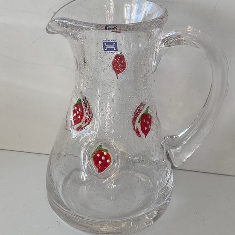 Den er laget av klart, munnblåst glass med små bobler og et dekorativt jordbærmønster. Hver mugge er unik og håndlaget. 1,1 liter.