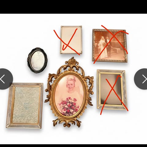 Selger en samling bilderammer i ulike størrelser og stiler. Her er både klassiske gullrammer, moderne rammer og flere rammer som fortsatt er uåpnet i original emballasje.