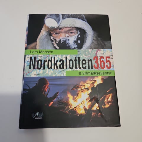 Lars Monsen Nordkalotten365 bok med 8 villmarkseventyr. Inneholder padlet med smik og isv i øvre Anárjohka, passiv båltur, merket i svenske Lappland, femmarksloppet 1000 kilometer, padlet i Lappland till Sætery, guvlloge og stålka i Lønsdalen, og med kano fra Enare til Nordshavet.