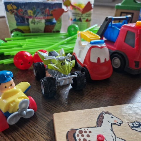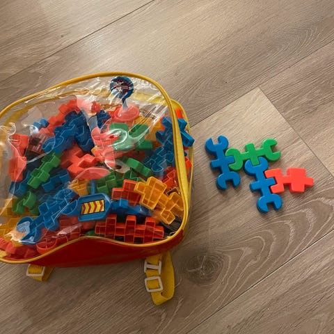 To ikeaplastposer (se bilde) med firkanter som kan bygges sammen på ulike måter, blant annet som firkanter. Masse kreativ lek for store og små. Vi har hatt dem med på fly og i bil som underholdning som varer lenge. Dette har fenget fra 2-14 år. Sendes gjerne med postnord for 69 kroner.