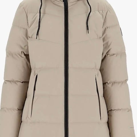 Parkasen er fylt med dun og har praktiske sidelommer med glidelås.