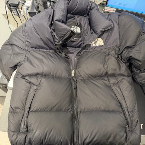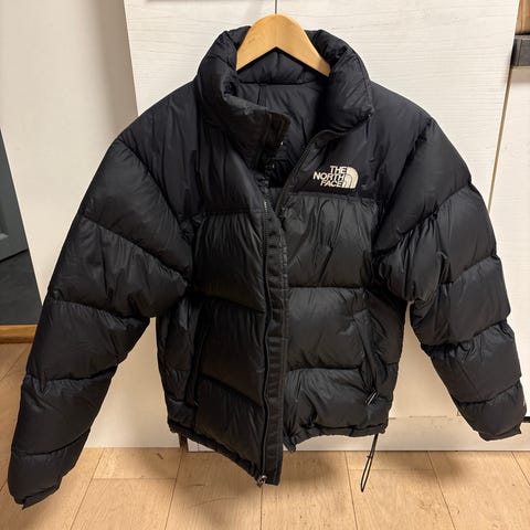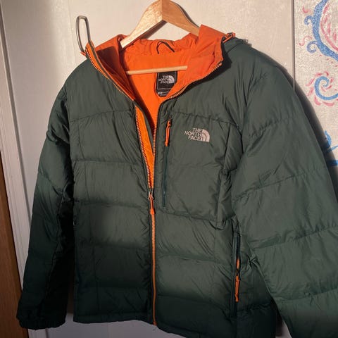 The North Face jakke i størrelse S for menn/kvinner laget av dun. Jakken har oransje farge med svarte partier, og er egnet for utendørs bruk.