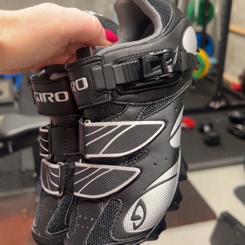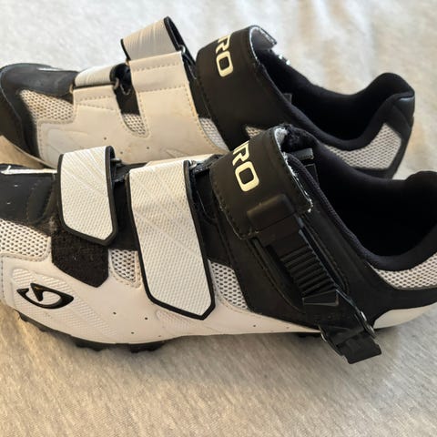 Giro sykkelsko i størrelse 45 med hvit og rød farge. Skoene har borrelås- og spennefester for justering. Designet for bruk med klikkpedaler.