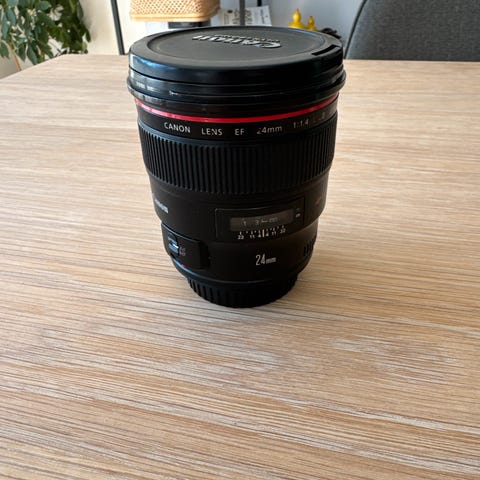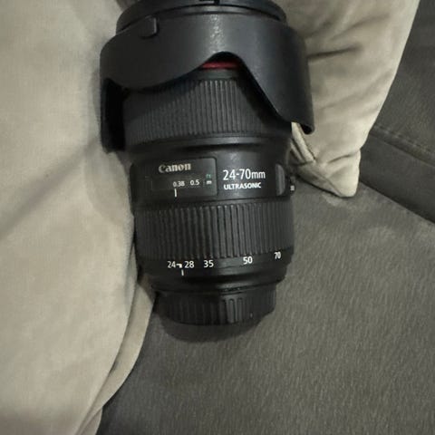 Canon 24-70mm f/2.8L USM objektiv med zoomfunksjon. Objektivet har en brennvidde på 24-70mm og en maksimal blenderåpning på f/2.8. Det er en del av Canons L-serie, kjent for høy optisk kvalitet.