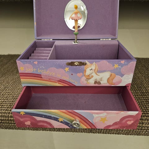 Lite brukt smykkeskrin med ei ballerina som snurrer rundt og musikk spilles. Denne har den klassiske musikken som de av oss født på 80- tidlig 90 tallet kan huske fra vår barndom.