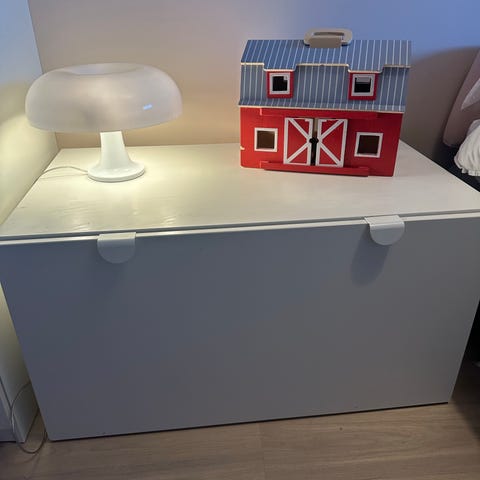 Sengen er brukt og har noe naturlig bruksslitasje i lakken (se bilder), men er ellers i god teknisk stand og fremstår som solid. Den grå fargen er nøytral og passer perfekt inn på både gutterommet og jenterommet.