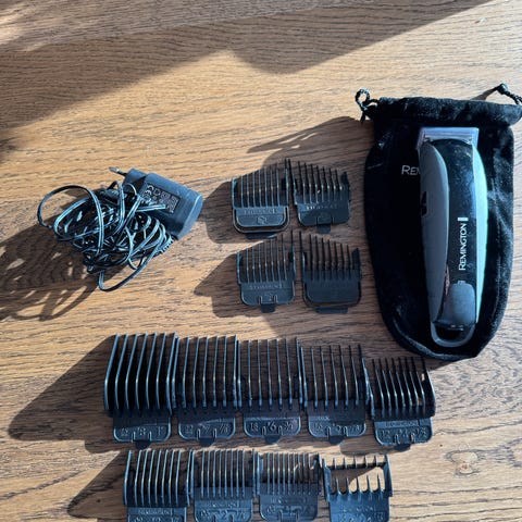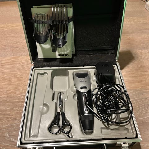 Philips hårklipper sett med flere tilbehør, inkludert kammer og ladekabel. Egnet for trimming av hår og skjegg.