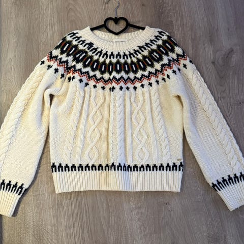 Grønn/grå strikkegenser med nydelig mønster. Meget pent brukt og fremstår som ny. Usikker på materiale da jeg var rask på å fjerne lappen, men er veldig behagelig å ha på seg :) Størrelse M.
