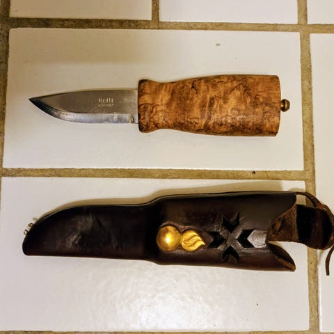 Blad av 3-lags rustfritt stål, lengde 7 cm. Lysebrun slire med innlegg.