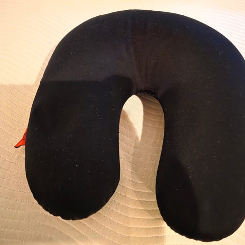 Grå reisepute i stoff med U-formet design. Puten har glidelås og knappelukking, og er beregnet for støtte av nakke under reise. Trekket kan tas av og vaskes. Er kun brukt en gang.