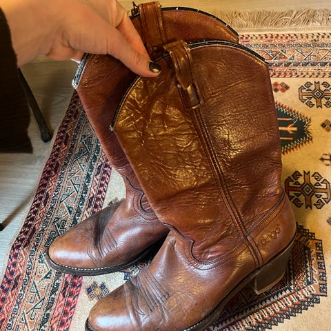 Boots fra Frye i størrelse 37. De er i lys skinn, med flotte unike detaljer. Designet inkluderer dekorative sømmer og en middels høy hæl. Gode og gå i og super kvalitet. Veldig lite brukt. Vintage ca 20 år.