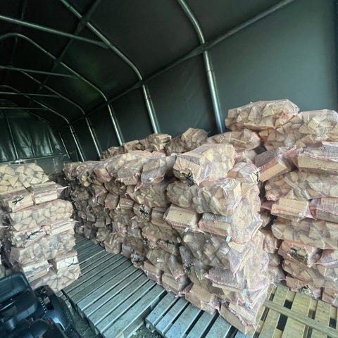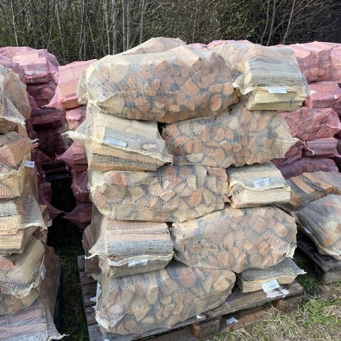 Tørr ved i småsekker på 40 liter. Hovedsakelig bestående av granved men også noe furu.
