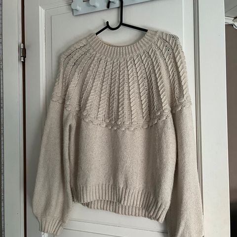 3) stripete hvit og rød «heklet» genser fra H&M, som er fin til å bare kaste over seg og som varmer godt nok til både Vår til Høst! Strl M