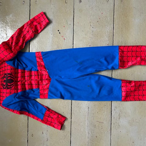 Standard Spidermandress med borrelås-lukking bak, muskler på bryst, skuldre og øvre armer. Bena er uten muskler.