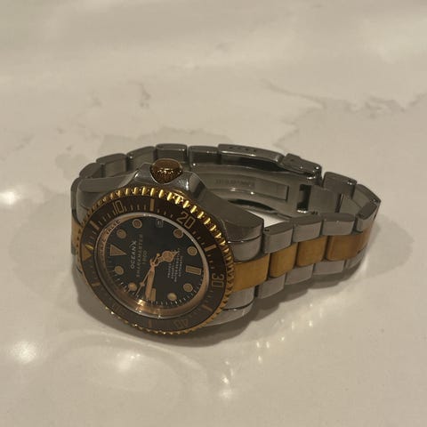 Selger en lite brukt 1000m svømmeklokke i twotone rosegull med hvit skive og blått bezel