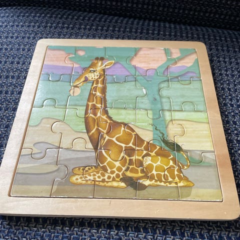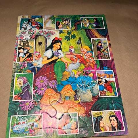 Vintage Puslespill fra min barndom, med motiver av barn, dyr og eventyrfigurer. Puslespillet består av flere biter som sammen danner bilder av barn i ulike situasjoner, blant annet en skolegårdsscene, et eventyrhus med karakterer, og et portrett av et barn.