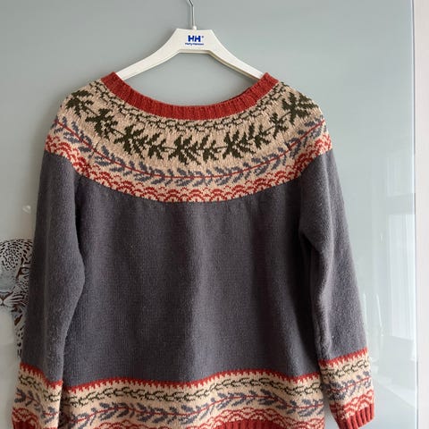 Senapsgul strikkegenser med fint mønster og puffermer. Har noen nupper når du ser på nært hold, ellers god stand. Veldig koselig stoff å ha på seg og fin passform.