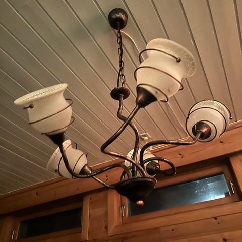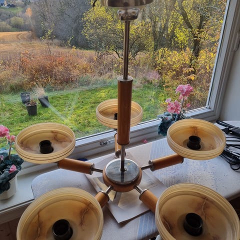En vintage lysekrone, sannsynligvis fra 1930- eller 1940-tallet, med en base i tre og lampeskjermer av alabast-lignende glass.