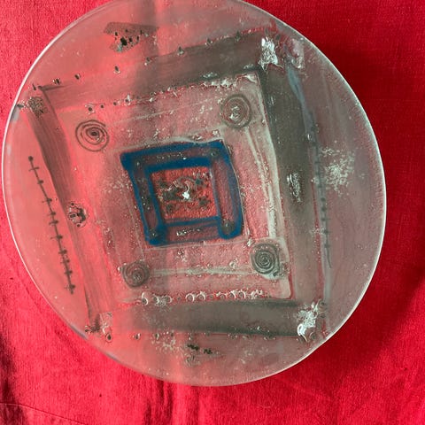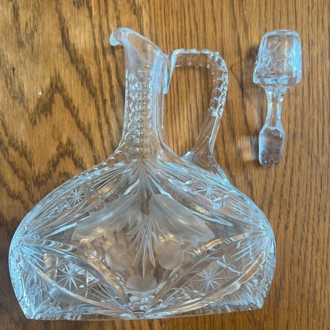 Elegant karaffel med tilhørende glass. Passende fat medfølger. Pent brukt, fremstår nærmest som nytt. Dekorativt på et bord, hylle, vitrineskap eller på benken.
