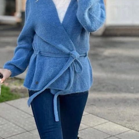 Denne er kjempedeilig å fin i modellen. Så og si ubrukt men jeg har en i en annen farge som jeg bruker hele tiden. Den er ganske stor og oversize. RAH som er norsk men laget i Italia. Nypris på denne er 2200,- +. Det er en fin A-fasong og vide armer. Jeg har brukt en av disse ganske mye i over et år og det kommer ingen nupper. God og myk. Det er riktige farge på modell bilde. Den er veldig fin og bruke over kjoler på sommeren for den er såpass lang. Ullmix.