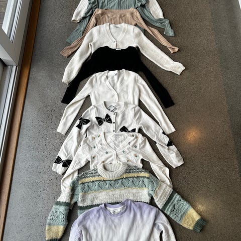 Selger en fin klespakke med rosa toner. Plaggene passer godt sammen.