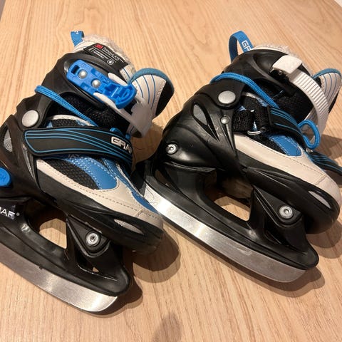 Graf Barneskøyter i størrelse 27, egnet for ishockey. Skøytene har justerbar størrelse fra 27 til 30, og er utformet i svart og hvitt materiale. Passer for barn som ønsker å delta i ishockey.