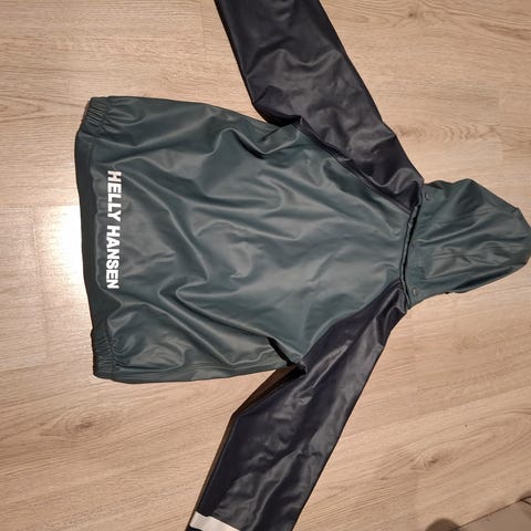 Helly Hansen regntøy har hengt på skolen som ekstra regntøy selges billig da det er noen flekker inni regntøyet,har aldri vært vasket så kan hende det går bort i vask.