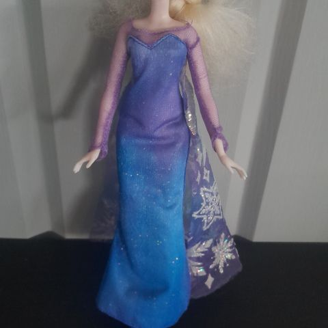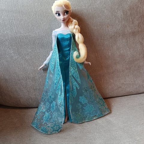 Disney Frozen Elsa kosedukke med blå kjole og blonde detaljer. Laget av stoffmateriale. Dukken framstår pen, men mønsteret på kappen har begynt å smuldre opp litt.