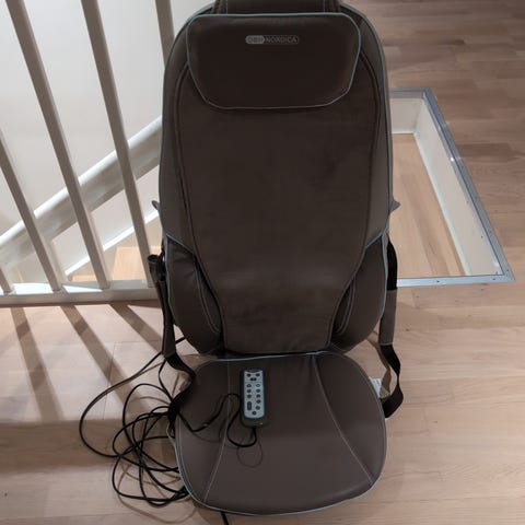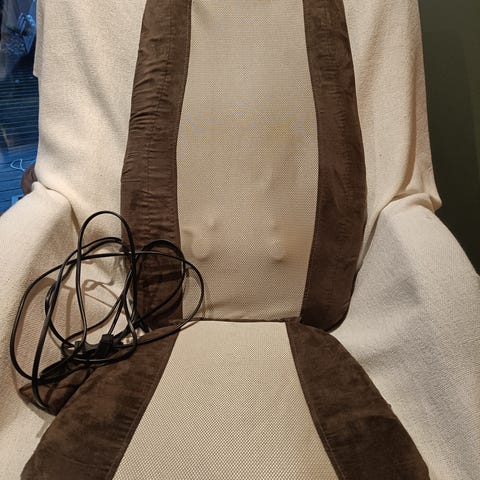 Masserer skuldrer og rygg. Justeres med fjernkontrollen. Settes i en stol eller sofa.
