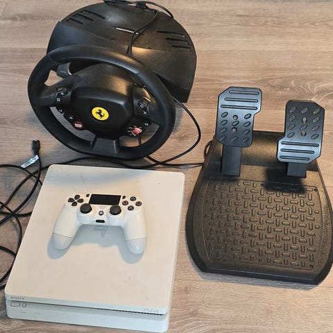Sony PlayStation 4 spillkonsoll med en rød trådløs kontroller. Inkluderer nødvendige kabler for tilkobling og lading. Konsollen har en kompakt design og passer for spillere som ønsker tilgang til PlayStation 4-spill.