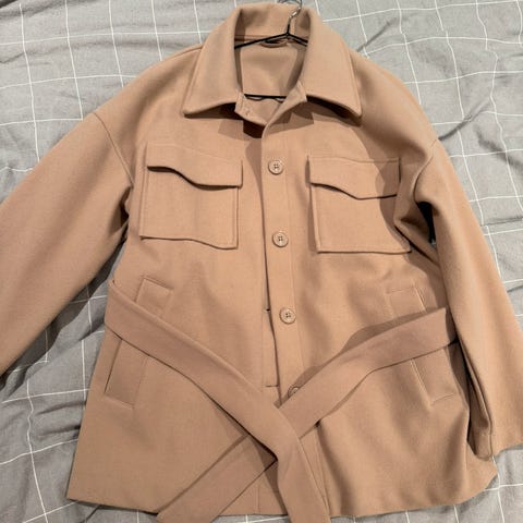Selger denne fine kåpen fra Gina Tricot. Den er i fargen grå og størrelse S. Jakken har belte og en klassisk kåpestil. Den har begynt å nuppe flere steder, men det kan nok fjernes med nuppefjerner.