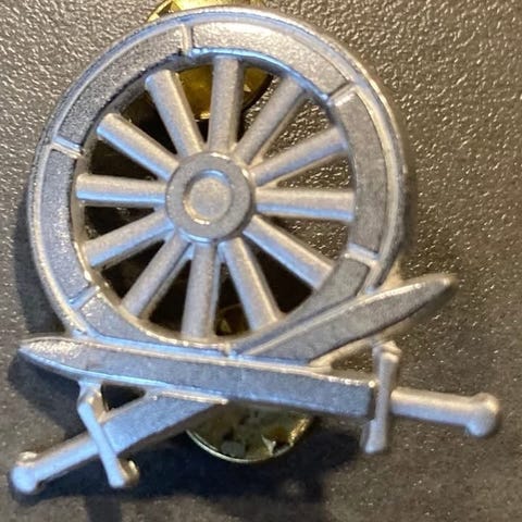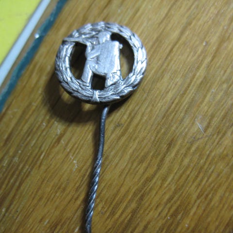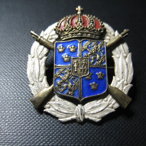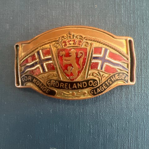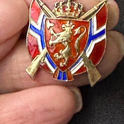 Norsk skytteremblem i metall med rød emalje og detaljer som inkluderer to kryssede geværer og et skjold med løve og krone. Emblemet har en nål på baksiden for feste.