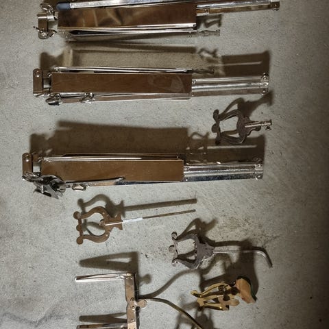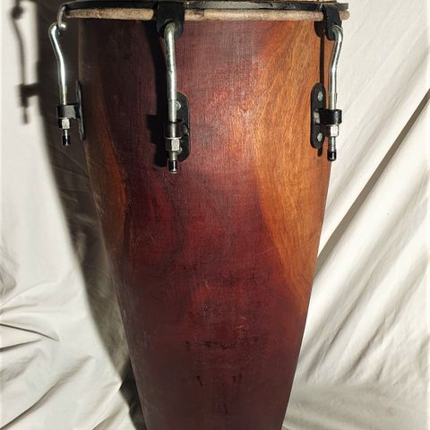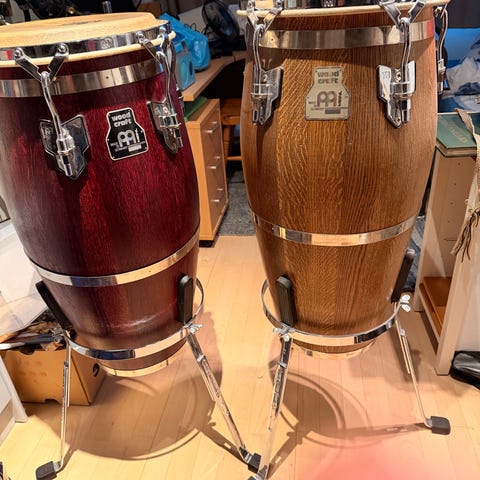 Meinl HCS12MA-11 congas i naturfarge med 11 og 12 tommers diameter. Laget av Hevea brasilinienis/rubber tree med naturhud (buffalo drum skins), designet for akustisk bruk. Kommer med stativ og beskyttelsesvesker. Stativene er høydejusterbare. Koster 7399,- nye hos Thomson. Congassene ser nesten ubrukte ut, bortsett fra 11 timeren som har fått seg en skrape. Baggeneer nesten nye og koster 768,- hos Thomann.