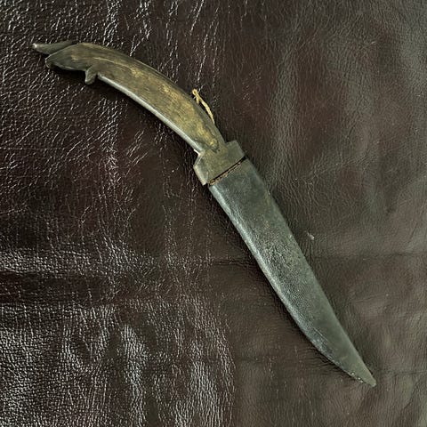Tradisjonell kniv med treskaft og dekorert slire. Knivbladene har ulik størrelse og form, og slirene er utsmykket med intrikate mønstre. Knivene har lærreimer festet til slirene for bæremulighet. Passer til bruk innen friluftsliv og tradisjonelt håndverk.