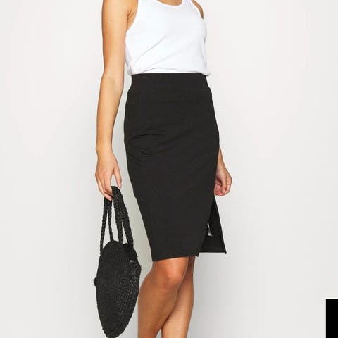 Tynt skjørt fra Even&Odd i mørkegrønn med hvite prikker. Størrelse L. Meget pent brukt.