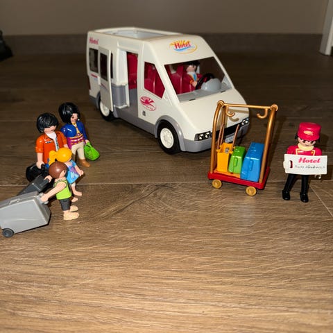 Playmobil barnleker som inkluderer en bil med tilhenger og flere figurer. I fin stand.