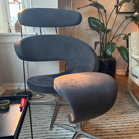 Bruno Mathsson lenestoler med fotskammel i rød farge i ull.Selges samlet.Lenestolene har et unikt og moderne design med metallramme og polstring i tekstil. Passer til bruk i stue eller kontor.