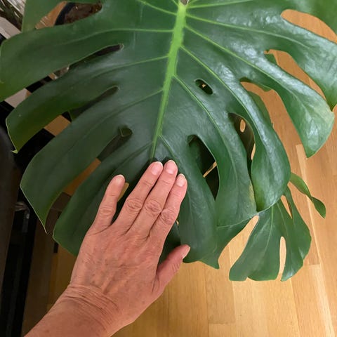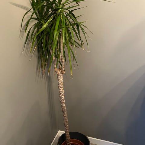 Innendørs plante med lange grønne blader. Planten er plassert i en grå potte og står på et tregulv. Egnet for innendørs dekorasjon og forbedring av inneklima.