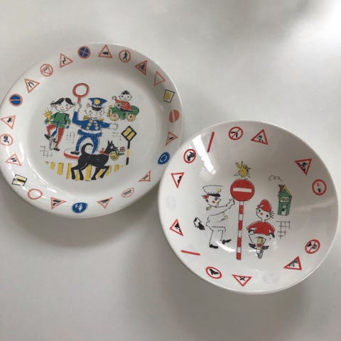 Rett Start barneservise. Slitesterkt servise i ripesikker melaminplast. Tallerkener og skål med motiv fra Elsa Beskows Blomsterbarn og smånissene. Gummiring under tallerkenen (den ene er litt ødelagt, se bilde). Samt tallerken og kopp med motiv av bamse verdens sterkeste bjørn også fra Rett Start.