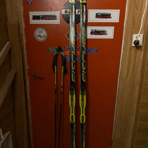 Selger et pent brukt sett med Fischer langrennsski og tilhørende Fischer skisko. Skiene er lette og raske, og passer godt til både trening og tur. Skoene er størrelse 39, medfølger staver også
