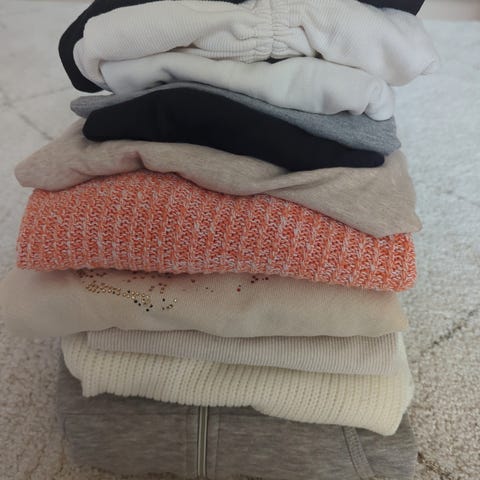 Ungdommen har ryddet i klesskapet og selger bukser og gensere som hun ikke lenger bruker.