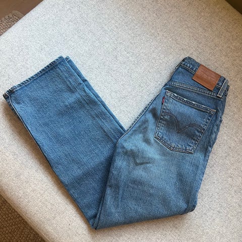 Selger godt brukt Levis Ribcage Straight Ankle bukse, størrelse 26W. Buksen er slitt i sømmen mellom lårene, se bilde.